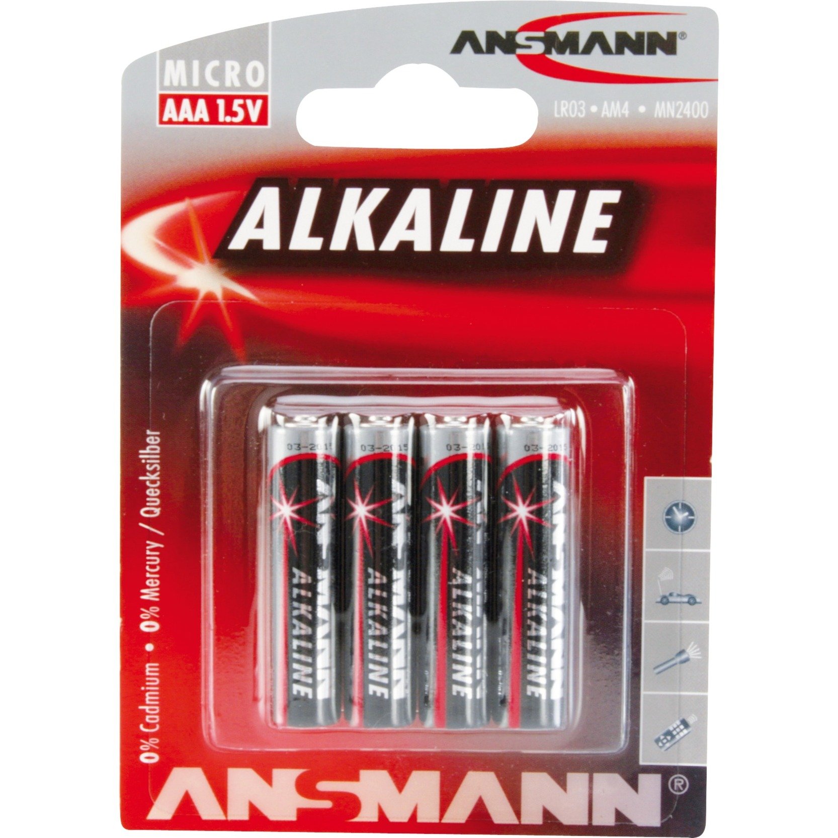 Tecnologia batteria: Alcalino, Voltaggio della batteria: 1,5 V. Larghezza: 10,5 mm, Profondità: 10,5 mm, Altezza: 44,5 mm. Tipo: AAA / LR03