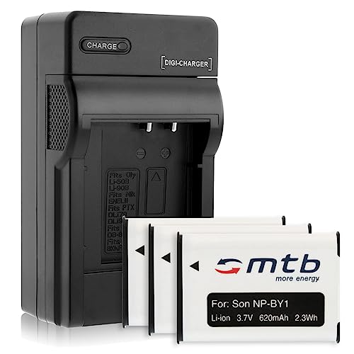 3x Batterie + Caricabatteria (Auto/Corrente) NP-BY1 NPBY1 compatibile con Sony HD Action Cam Mini AZ1 con Wi-Fi/HDR-AZ1 (KIT), HDR-AZ1VR