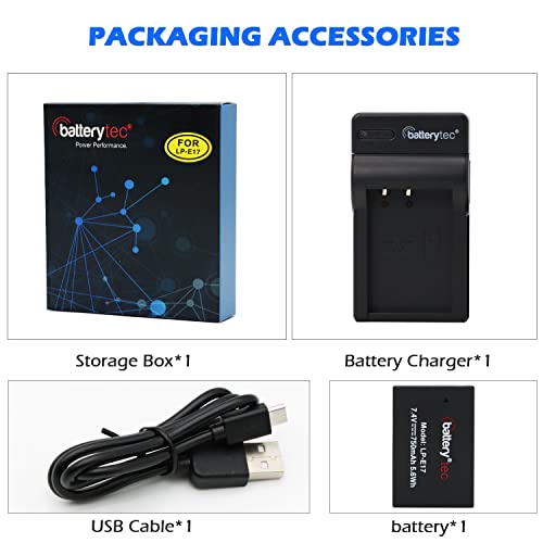 Batterytec Batteria sostitutiva per Canon telecamera LP-E17,Canon EOS RP, 200D 77D 750D 760D, EOS 800D 8000D, Digitale SLR telecamera e caricatore portatile micro USB.