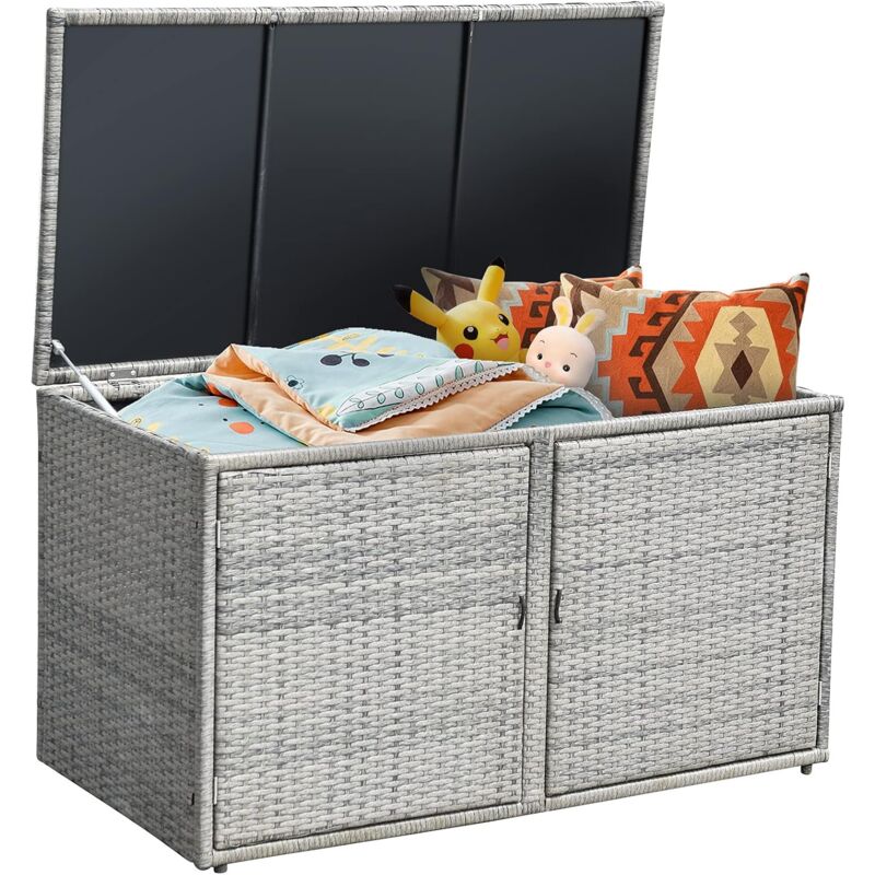 INFORMAZIO Spazio di Stoccaggio Adeguato: Progettato con l'idea di un ampio spazio di archiviazione, il contenitore con 2 ripiani può contenere fino a 335L di oggetti multipli, come attrezzi da giardino, giocattoli e attrezzature sportive, ecc. Vi permetterà di avere gli oggetti di uso più comune sempre a portata di mano. Struttura Robusta e Duratura: Realizzato in rattan PE resistente alle intemperie, il contenitore può essere lasciato all'esterno e non si deforma né si rompe facilmente. Il telaio in acciaio super resistente garantisce un'eccezionale robustezza e stabilità. Inoltre, i feltrini antiscivolo proteggono il pavimento dai graffi. Design a Ribalta e Doppie Porte: Dotato di un design a ribalta e di porte anteriori, il box da terrazza offre uno spazio sicuro per i vostri oggetti. Inoltre, le 2 barre di sicurezza a gas forniscono un supporto affidabile quando si apre il coperchio. Le maniglie in corda e i fermi magnetici facilitano l'apertura e la chiusura delle porte.