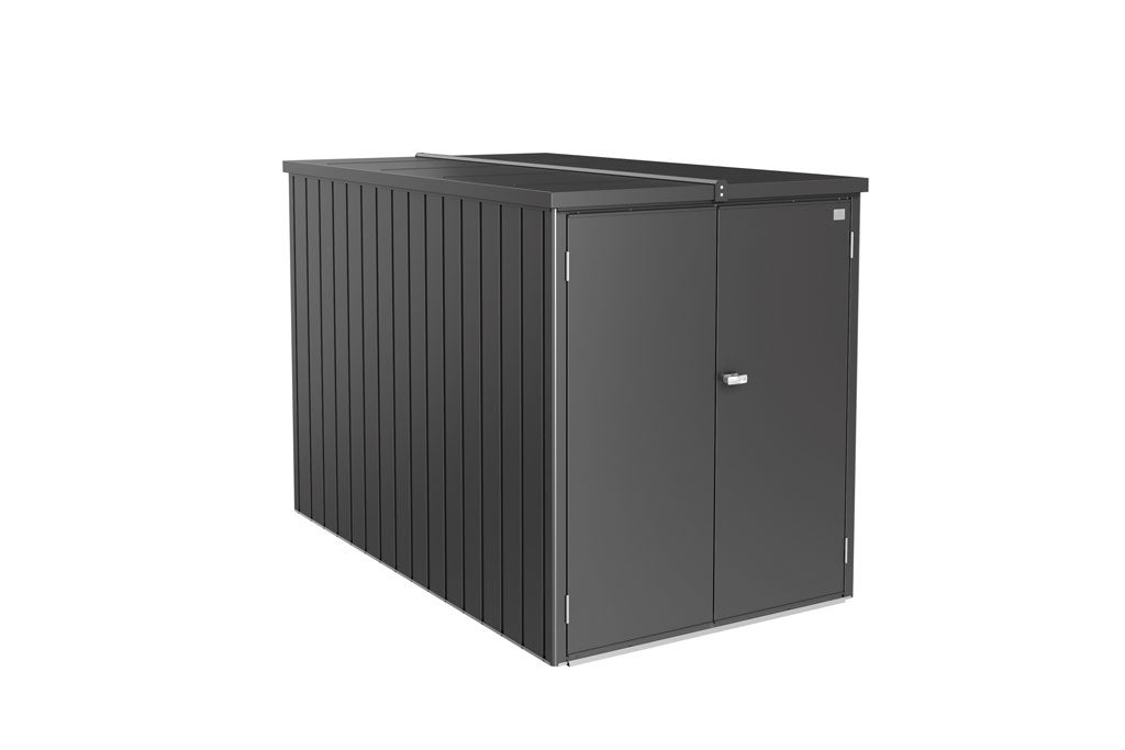 Ottenere spazio in modo semplice senza richiesta di autorizzazione. Nel MiniGarage potete riporre in modo ideale 2 biciclette o attrezzi e mobili da giardino ecc. Con un'altezza di soli 145 cm, in linea di principio non è soggetta a nessuna approvazione normativa*. L'intelligente sistema a rotaie (opzionale) rende più facile posare la bicicletta: Posizionare la ruota posteriore sulla guida da pavimento, inserire il manubrio della bicicletta sulla guida superiore estraibile, spingere dentro, fatto! Per riporre l'attrezzatura da giardino c'è il sistema estensibile di scaffali a 2 ripiani (lunghezza 150 cm). Il MiniGarage - polifunzionale nell'uso, moderno nel design.