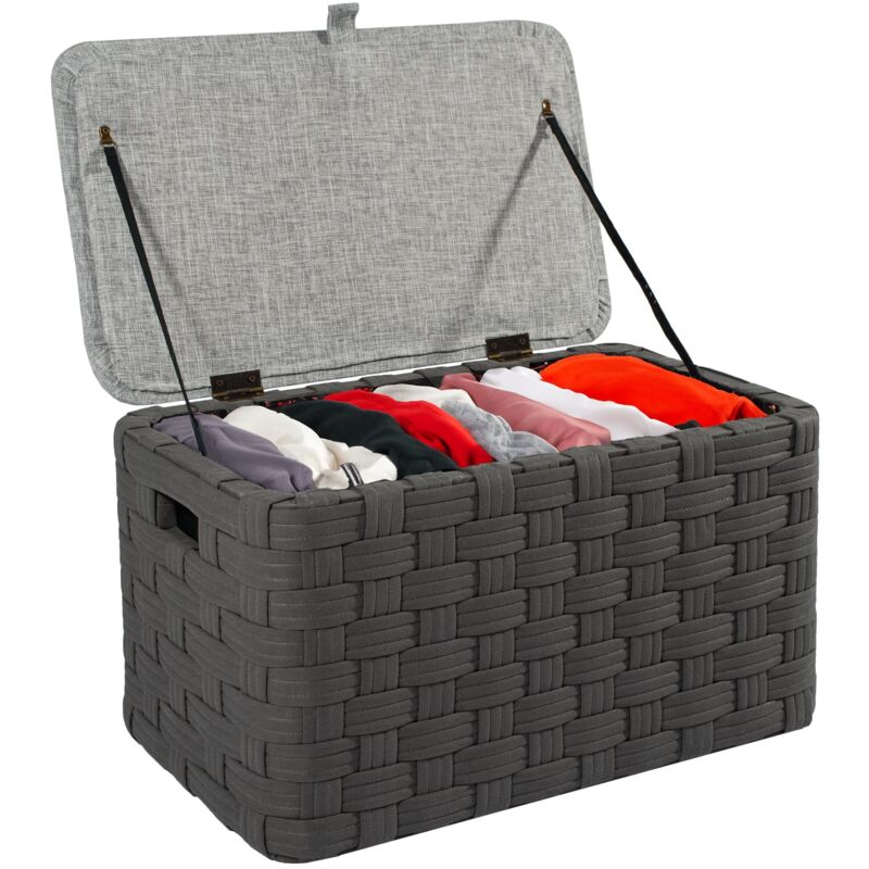 Baule NALA, grafite 65L S 56X34X34 cm Destinazione d'uso: per ingresso, soggiorno, camera da letto Colore: grafite Il pouf Nala è una perfetta combinazione di funzionalità, estetica e comodità di utilizzo. La sua solida costruzione si basa su materiali di alta qualità, che lo rendono non solo durevole, ma anche eccezionalmente efficace. Il sedile in tessuto è realizzato in tessuto non tessuto di poliestere, imbottito con delicata schiuma, che garantisce non solo comfort durante la seduta, ma anche la durata del prodotto. Il contenitore Nala ha un aspetto elegante nel colore grafite, che lo rende perfettamente adattabile a varie disposizioni interne. La sua struttura in legno garantisce solidità e stabilità durante l'utilizzo. La base rinforzata protegge inoltre gli oggetti riposti mantenendo il pouf in perfetta forma. Finiture estetiche curate nei dettagli e una struttura intrecciata dal motivo accattivante conferiscono al Pouf Nala un carattere unico. La possibilità di utilizzarlo in