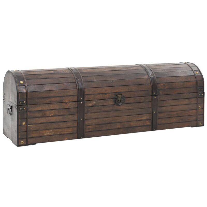 Descrizione: Questo baule in stile vintage costituisce un'aggiunta pratica e decorativa alla vostra casa! Questo baule dall'aspetto anticato è realizzato in legno massello ed è decorato con cinghie in pelle artificiale ed elementi metallici che ne accentuano lo stile vintage. Il baule in legno è dotato di un ampio vano interno dove riporre vestiti, libri, riviste e qualsiasi altro oggetto che si desidera tenere a portata di mano ma nascondere alla vista. Grazie al gancio di chiusura e alle maniglie in stile vintage il mobile è facile da chiudere e da spostare. Non è necessaria alcuna operazione di assemblaggio. Specificazioni: Colore: Marrone Materiale: Legno massello Dimensioni: 120 x 30 x 40 cm (L x P x A) Con cinghie decorative in pelle artificiale e dettagli in metallo Stile vintage Non necessita di montaggio