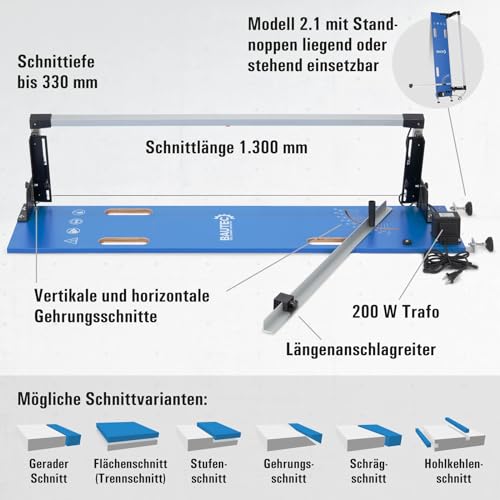 BAUTEC Tagliatrice di Schiuma » GAZELLE modello 2.1 » 200 Watt » Lunghezza di taglio 1.300 mm » incl. 10 fili di taglio + Raspa in polistirolo » Taglierina a filo caldo » Tagliatrice per Polistirolo