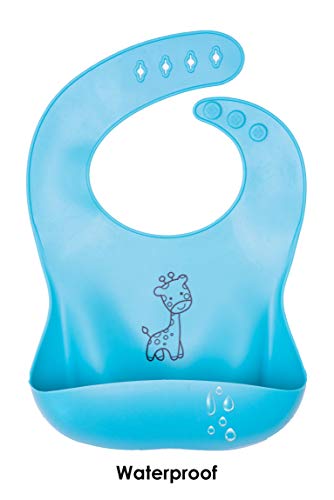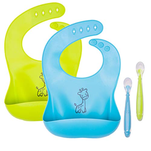 Bavaglini neonato, neonata, bambino in silicone morbido con comoda tasca raccogli pappa più due cucchiaini a manico lungo, anallergici, certificati facili da lavare set di due colori (azzurro/verde)
