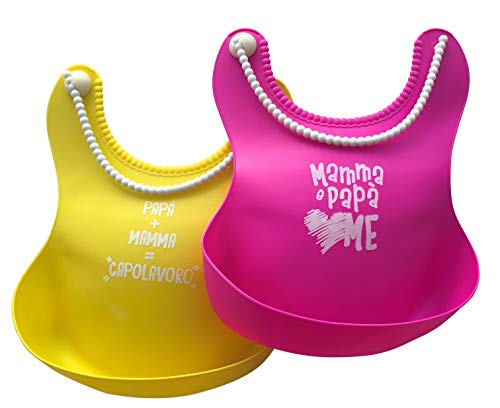 Bavaglini neonato in silicone | Impermeabili, Facili da pulire | Tasca Raccogli Cibo | Set 2 bavaglini in silicone per bambini e neonati | (Rosa, Giallo)