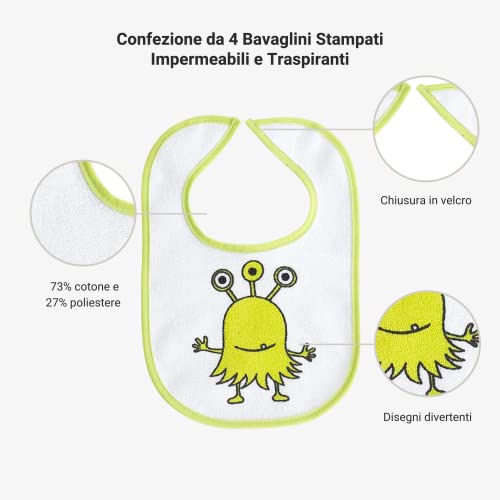 ✔️ Confezione da 4 bavaglini stampati impermeabili e traspiranti, con chiusura in velcro molto utili per evitare che il bambino si sporchi durante i pasti o si bagni con i suoi vestiti che si indossa.