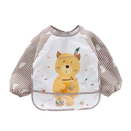 Bavaglino Grembiule per Neonato Bambino Unisex Impermeabile con Maniche Lunghe Stampa di Cartoni Animati per Mangiare Dipingere Giocare (Orso, Taglia Unica)