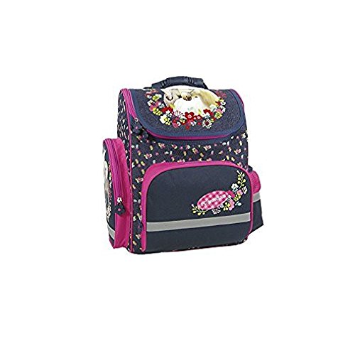 Zaino con schienale imbottito e riflettori sulla tasca anteriore e in corrispondenza del lembo di chiusura. Peso a vuoto: 1.050 g, in poliestere con stampa glitter, altezza ca. 35 cm, larghezza ca. 27 cm, profondità ca. 16 cm. Set composto da: zaino, portafoglio, contenitore per la merenda, borraccia, sacchettino per le scarpe e astuccio.