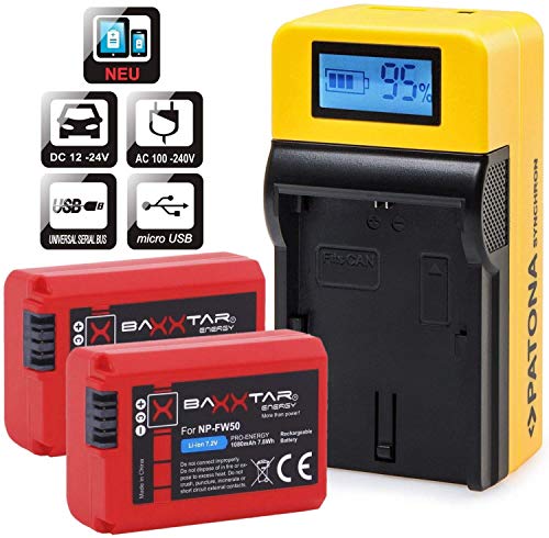 2x Baxxtar PRO Compatibile con batteria Sony NP-FW50 (1080mAh) + LCD Caricatore 5in1 - con ingresso MicroUSB e uscita USB, per caricare un terzo dispositivo come Smartphone