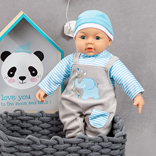 Bayer Design Bambole di 40-46cm, Tuta, Top e Berretto, Set, Vestito con Elefante, Colore Blu, Grigio con Strisce, 84676AA
