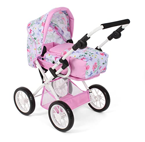 Bayer Chic 2000 - Passeggino per bambole Leni, 2 in 1 con borsa per il trasporto rimovibile, fiori, rosa, viola, 560-53