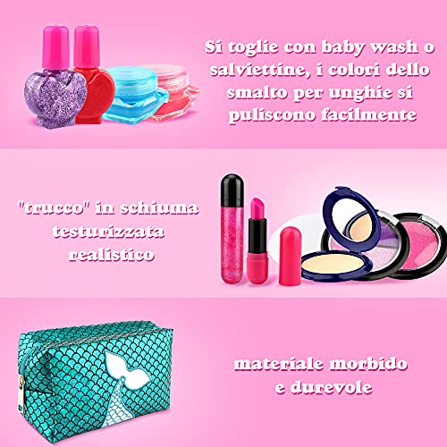 Non tossico e lavabile: realizzato in materiale atossico e sicuro, di alta qualità e robusto. Il lucidalabbra e lo smalto per unghie sono a base d'acqua, facili da lavare, nessun odore, nessuna irritazione della pelle, liberando la tua preoccupazione. Le bambine si divertiranno a truccarsi senza distruggere il costoso trucco della mamma.