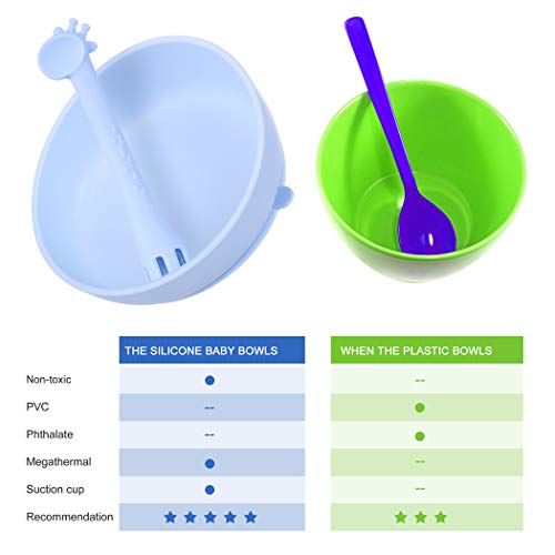 3. Le ciotole per bambini hanno una ventosa in silicone nella parte inferiore, è adatta a qualsiasi superficie liscia, eliminando il disordine di fuoriuscita. I piedi della giraffa come una forchetta, catturano e afferrano il cibo mentre il vostro bambino lo sta schiacciando nel piatto, il che rende per un tasso di successo alimentare per la bocca.