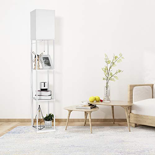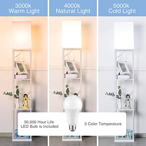 BBHome Moderna lampada a stelo con ripiani in legno, 3 temperature di colore, dimmerabile, lampada a LED per soggiorno, camera da letto, lampadina da 9 W inclusa (bianco)