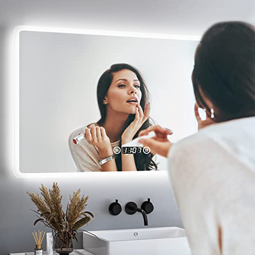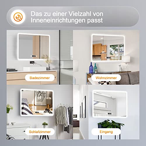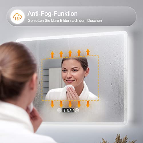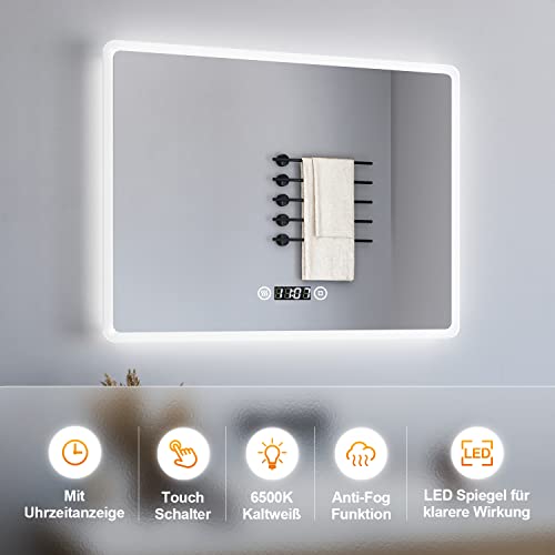 BD-Baode Specchio da bagno con illuminazione, 80 x 60 cm, con luce bianca fredda, specchio da bagno con interruttore touch, senza appannamento, orologio digitale, CRI 95+