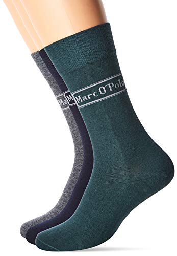 Calzini da uomo in pratica confezione da 3 pezzi della serie Marc O' Polo "Bent" in blu scuro, verde e grigio melange, ciascuno con logo bianco Heritage, scritta Marc O' Polo e indicazione della taglia sulla suola del piede lavorati a maglia con cucitura a mano in grigio accentuata nella parte superiore per una perfetta vestibilità con aghi fini e extra morbidi di qualità con alta percentuale di cotone