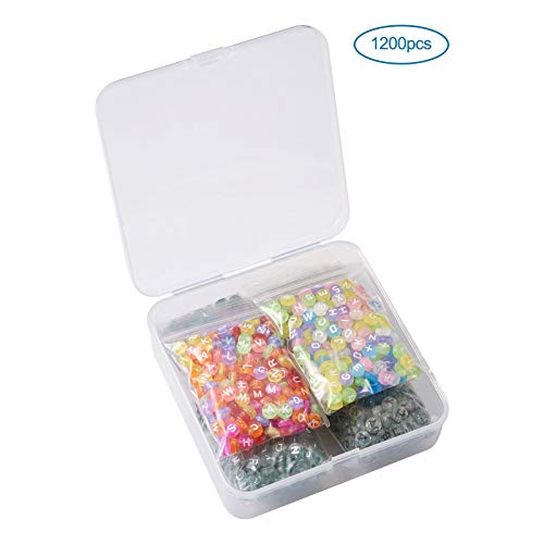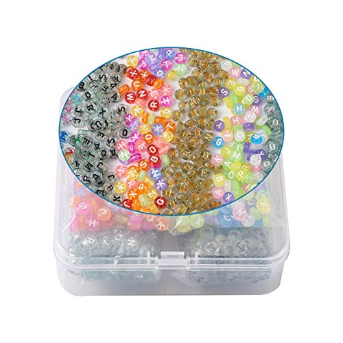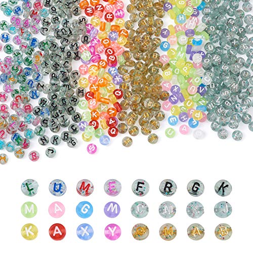 Beadthoven 1200 perline in acrilico a forma di lettere dell'alfabeto, 7 mm, trasparenti, piatte e rotonde, lettere A-Z, con polvere glitterata, per creare nomi su bracciali e gioielli, 6 stili