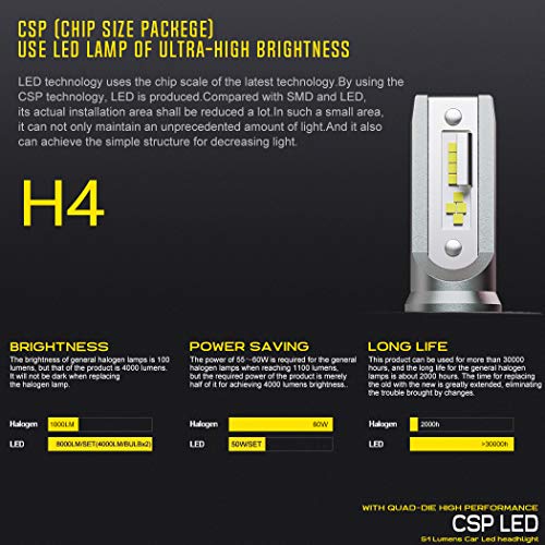 Lampadina LED H4, chip LED CSP coreano (lato laterale). Produce 8000 lumen, super luminosa con uscita 4000 lm per luce per guida di sicurezza durante la notte, 6500 K di colore bianco Xenon, molto più della lampada alogena e della lampada HID.