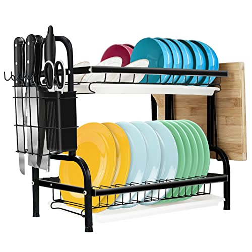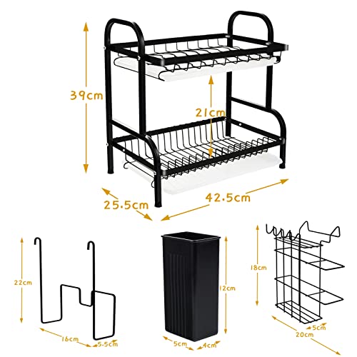 Bearsquad Scolapiatti da Appoggio da Lavello a 2 Livelli in Acciaio Inossidabile Grande Scolapiatti da Cucina Nero con Porta-Posate 42.5x25.5x39cm