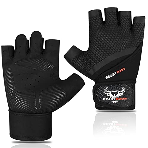 BEAST RAGE Guanti da palestra antiscivolo elasticizzati per allenamento della forza guanti imbottiti per sollevamento pesi del palmo per esercizi Crossfit allenamento ciclismo (nero, M)