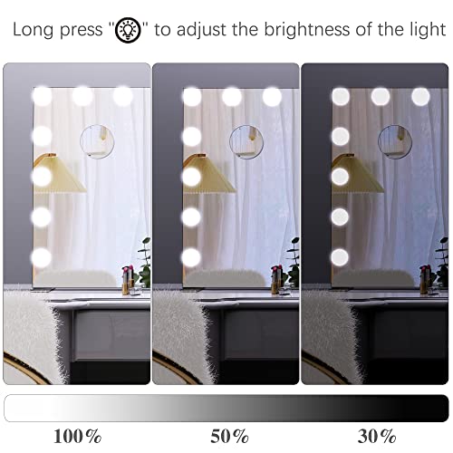 Regola il colore e la luminosità della luce: Il grande specchio illuminato di Hollywood è dotato di 16 lampadine dimmerabili e tre colori della lampada (luce fredda, luce naturale e luce calda) possono fornire una buona illuminazione e immagini prive di distorsioni. La luce soffusa non danneggia gli occhi.