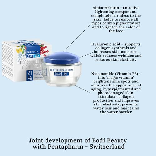 BODI BEAUTY BA Intense Whitening Cream, crema notte schiarente viso con acido ialuronico, niacinamide, camomilla, con 21% concentrato, cura del viso 50 ml
