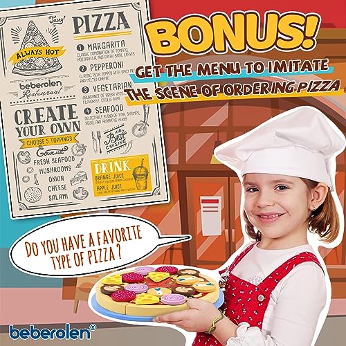Beberolen Pizza in Legno Bambini, Accessori Cucina Giocattolo da Educativi Montessori, Gioco di Ruolo, Regalo Creativo Compleanno Giorno dei Bambini Pasqua Halloween Natale Ragazzi Ragazze 3 4 5+ Anni