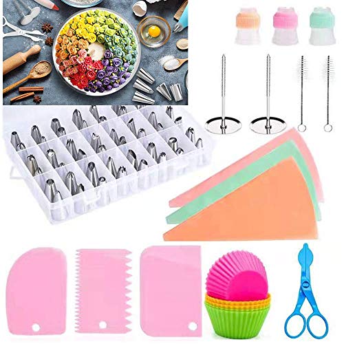 IN UN SET: Questo kit per decorare cupcake per torte è dotato di 48 ugelli per tubi standard, 3 sacchetti per tubi usa e getta, 3 raschietti per dolci, 2 chiodi per fiori, 6 stampi per cupcake, 3 adattatori per bocca, 1 forbice in plastica, 2 spazzole per la pulizia e una comoda scatola di immagazzinaggio.