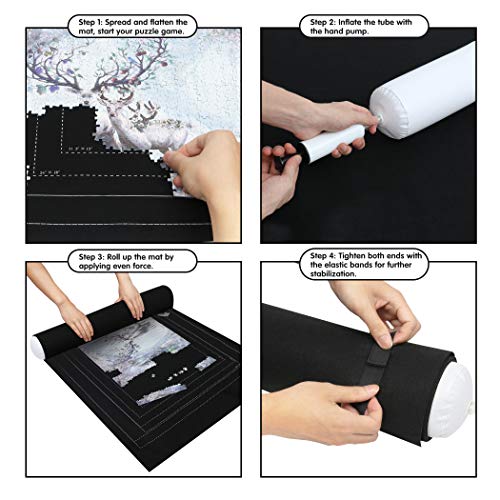 Accessori utili: un tubo gonfiabile è incluso per garantire che il gioco incompiuto sia ben riservato per la prossima volta. Per proteggere ulteriormente i tuoi puzzle dalla caduta a pezzi, due elastici sono chiusi per stringere entrambe le estremità del tappetino arrotolato.