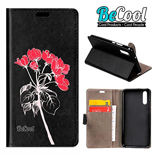 BeCool Custodia a Libro per Huawei P20, [Funzione di Supporto] Protegge e Si Adatta alla Perfezione al Tuo Smartphone e oltrettutto ha Il Nostro Disegno Esclusivo - Gerani Rossi.