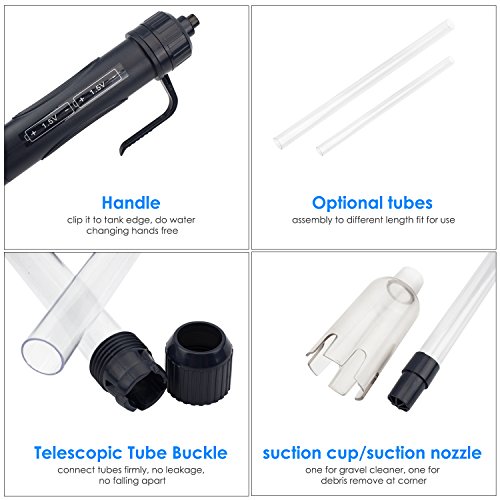 ✔ Detergente per ghiaia per acquario: è possibile scavare la testa direttamente nel letto di ghiaia dell'acquario, poi sollevare un po' per far cadere la ghiaia. Ripetere questo processo per aspirare tutte le parti leggere come la zappa di pesce e lasciare schegge nella ghiaia.