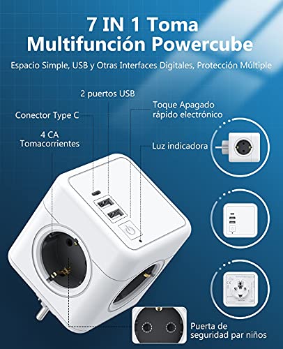 Beedove Presa USB 7 in 1 Powercube Ladron prese con 4 prese CA, tipo C e 2 porte USB (3A), cubo spina multipla con interruttore, compatibile con telefono, pad per casa ufficio viaggi