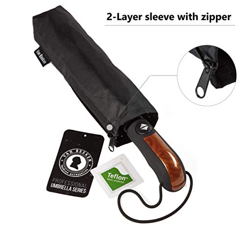 Compatto automatico: Stay dry con l'ombrello portatile Van Beeken. Equipped with a single-button design, this umbrella requires only one hand to open and close it quickly. Ha anche un manico antiscivolo con una cinghia da polso in modo che non cada.