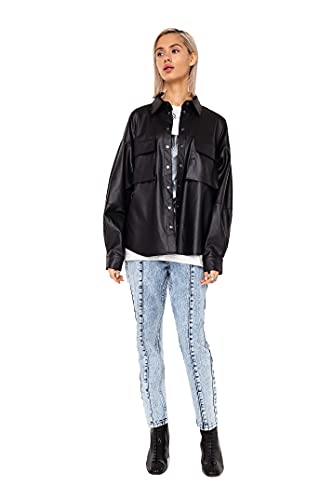 Camicia in similpelle con tasche applicate. Modello oversize, linea dritta, vestibilità ampia, colletto corto, linea spalla scesa, manica lunga, abbottonatura lunga con bottoni.
