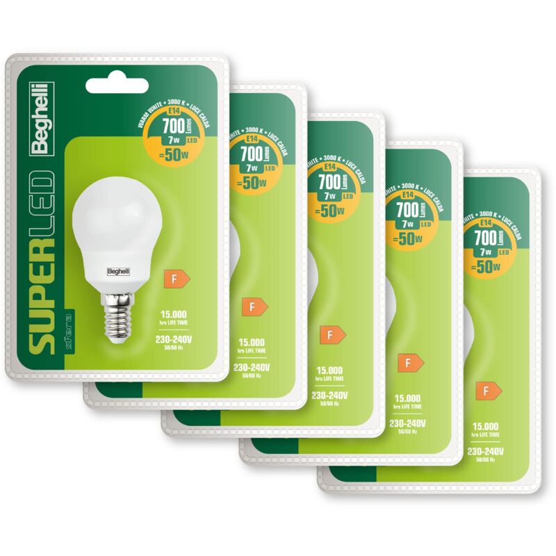 Le lampade Super LED Beghelli hanno una buona efficienza e con flussi fino 1500 lumen sono la soluzione economica per ogni installazione standard. Angolo fascio 160° - RA >80 Watt 7 lumen 700 attacco E14 temp. colore K 3000 dim. ØxL 45x80 vita (h) 15000 classe energ. F