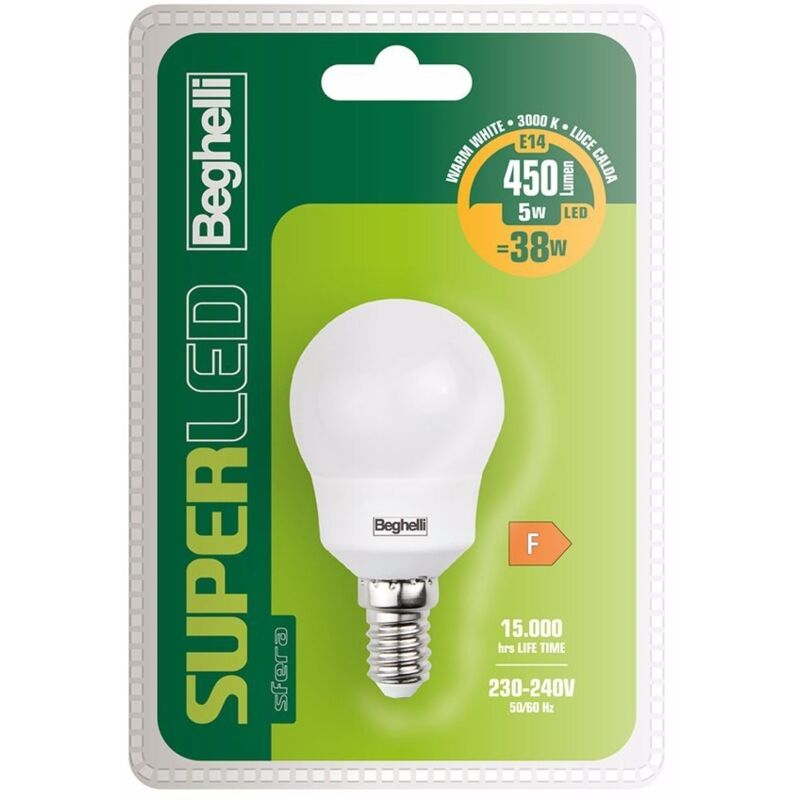 Lampadina superled sfera e14 5w 3000k lumen: 450 watt: 5 attacco: e14 luce: calda temp. colore k: 3000 dim. Øxl: 45x80 vita (h): 15000 classe energetica: f le lampade super led beghelli hanno una buona efficienza e con flussi fino 1500 lumen sono la soluzione economica per ogni installazione standard. angolo fascio 160° - ra >80 avvertenza: lampadina led non dimmerabile, non utilizzare con variatori di luce.