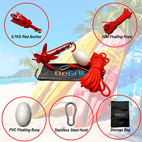 ⚓Kit completo di accessori di ancoraggio: 1 ancora rossa 0.7KG, 1 corda galleggiante 10m, 1 moschettone in acciaio inossidabile, 1 sfera galleggiante, 1 borsa BeGrit.
