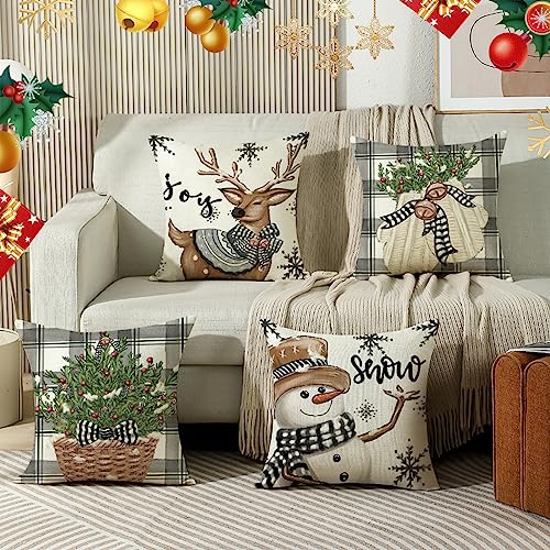 Bekecidi Set di 4 Fodere per Cuscini Natalizi, Federa Quadrata in Lino Pupazzo di Neve Alce Copricuscino per Divano per Decorazioni per Feste Natalizie Decorazioni per la casa, 45x45cm