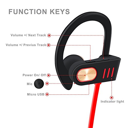 Beleen, cuffie in Ear Bluetooth, con microfono, V4.1, resistenti al sudore, impermeabili IPX5, riproduzione suono di ottima qualità, con bassi e riduzione del rumore, vestibilità ottimale, ideali per allenamento in palestra e sport (colore rosso)