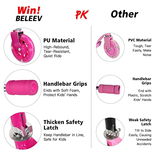 BELEEV Monopattino per Bambino con Supporto, 3 Monopattini per Bambini Regolabili in Altezza, Monopattino Scooter per Bambina con Il LED Illumina le Ruote per Ragazze e Ragazzo (Hot Pink)