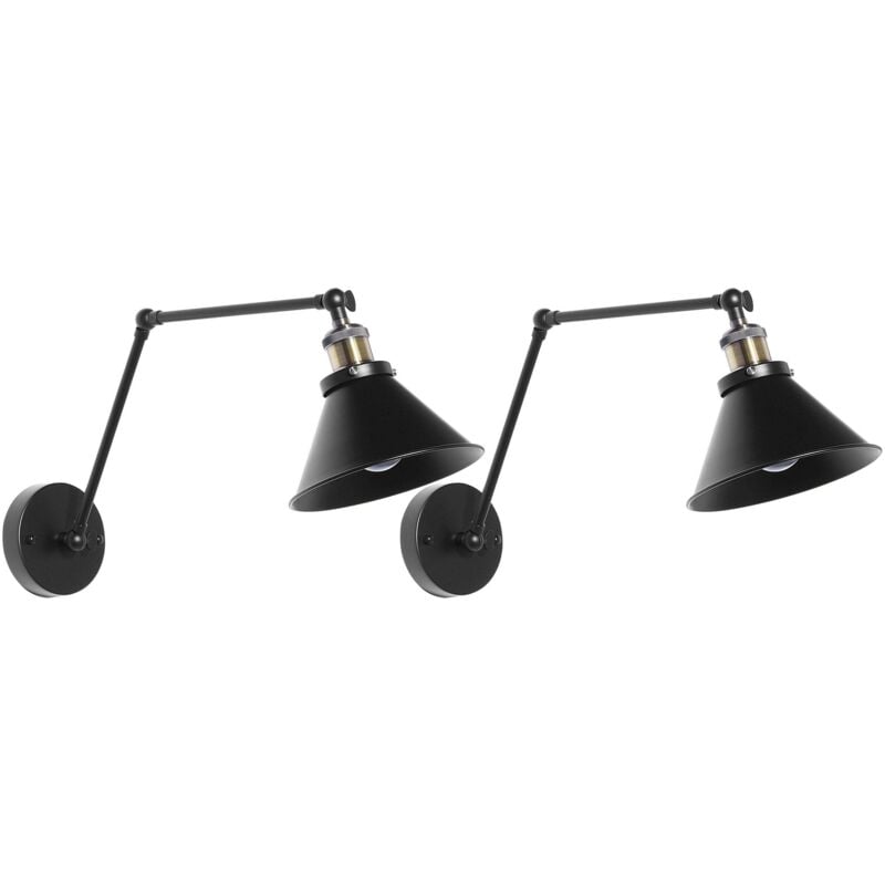 Coppia di applique orientabili. Versatile e dallo stile senza tempo, questo set di lampade da parete s'integrerà perfettamente sia con interni dal design moderno, classico o industriale. Il braccio regolabile in tre posizioni, ne consente un facile utilizzo. La forma conica del paraluce in metallo lo rende elegante, mentre i dettagli color ottone lo rendono adatto a ogni tipo di decorazione. Dettagli: Tipo di prodotto: Applique Stile: Industriale Colore principale: Nero Tipo di materiale: Metallo Materiale principale: Metallo Materiale del paralume: Metallo Potenza elettrica: Max. 40W Codice IP di protezione: IP 20 Lampadine richieste: 2 Voltaggio: 220-240 V (50 Hz) Dimensioni: Profondità: 73 cm Larghezza: 19 cm Altezza: 20 cm Peso: 1 kg L'offerta include: 2 x Lampada da parete, Non include: Lampadine Caratteristiche chiave: Paralume regolabile, Installazione facile e rapida, Braccio regolabile, Adatto a ogni stile di decorazione d'interni, Arredo decorativo e funzionale, Risparmio