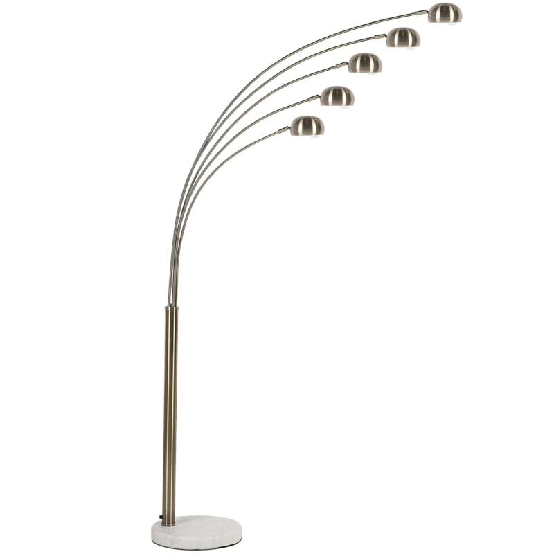 Lampada da terra dal design originale. Questa lampada da pavimento arcuata, è la scelta perfetta per portare un tocco retrò in soggiorno o in camera da letto. Realizzata in durevole metallo, è dotata di 5 bracci regolabili. La solida base in marmo offre la massima stabilità, mentre la sua luce calda e diretta, la rende ideale per la lettura. Dettagli: Tipo di prodotto: Lampada da pavimento Stile: Moderno Colore principale: Oro Tipo di materiale: Metallo Materiale principale: Ferro Materiale secondario: Marmo Materiale della base: Marmo Materiale del paralume: Metallo Potenza elettrica: Max. 40W Finitura: Cromata Codice IP di protezione: IP 20 Lampadine richieste: 5 Voltaggio: 220-240 V (50 Hz) Dimensioni: Dimensioni della base: 35x35 Lunghezza del cavo: 192 cm Profondità: 100 cm Larghezza: 100 cm Altezza: 212 cm Peso: 17 kg L'offerta include: 1 x Lampada da pavimento, Non include: Lampadine Caratteristiche chiave: Ideale anche come illuminazione da lettura, Arredo decorativo e