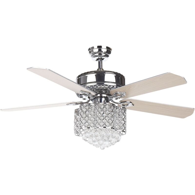 Lampada a sospensione con ventilatore e telecomando. Porta un tocco glamour in soggiorno o in camera da letto con questo ventilatore da soffitto con lampadario integrato. I preziosi strass e i motivi decorativi in vetro acrilico riflettono la luce in modo ottimale, mentre il pratico telecomando con timer offre il massimo comfort. Dettagli: Tipo di prodotto: Ventilatore da soffitto con luce Stile: Glamour Colore principale: Legno chiaro Tipo di materiale: Metallo Materiale principale: Ferro Materiale secondario: Vetro acrilico Materiale della base: Ferro Materiale del paralume: Vetro acrilico Parti regolabili: lunghezza del cavo Potenza elettrica: 40W Finitura: Cromata Codice IP di protezione: IP 20 Consumo energetivo: 70 W Lampadine richieste: 3 Tipo di motore: AC Livello di rumore: 57 RPM (rotazioni al minuto): 199 Voltaggio: 220-240 V (50 Hz) Dimensioni: Dimensioni della base: 15x15 Lunghezza del cavo: 36 cm Profondità: 134 cm Larghezza: 134 cm Altezza: 59/69 cm Peso: 12 kg