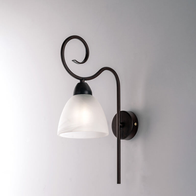 Collezione Aurelio STILE PULITO ED IMPONENTE PER COMPLETARE IL VOSTRO ARREDAMENTO Applique 1 luce in ferro battuto nero con decorazione ruggine. Una base tonda un braccio che termina con una curvatura a ricciolo eseguita abilmente da esperti artigiani del settore ed infine corredato da un piccolo e grazioso diffusore in vetro alabastro bianco. La tonalità nera con decorazione ruggine a contrasto coi vetri bianchi si abbina perfettamente con lo stile classico o in arte povera.