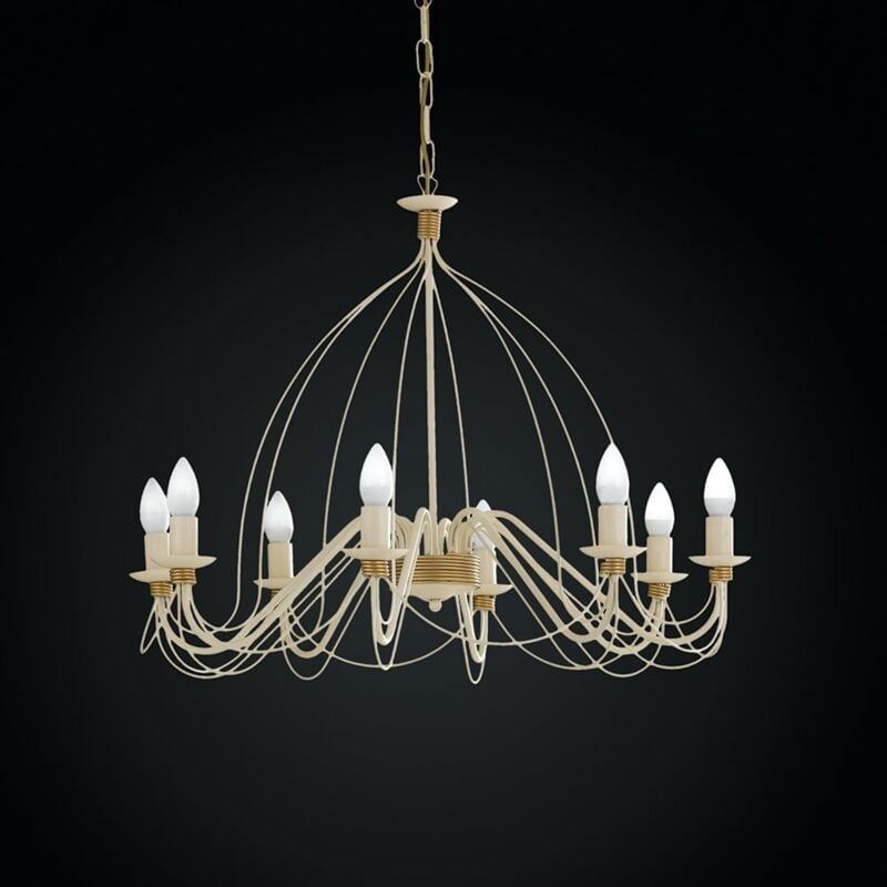 Collezione Rustico LO STILE COUNTRY CHIC CREA AMBIENTI FAMILIARI E CALDI Lampadario 8 luci in puro stile fiammingo, in ferro laccato con lavorazione decapè avorio e rifiniture oro. Struttura con bracci arcuati che terminano con portalampade a vista effetto candela. Un lampadario lineare ma ricercato, che racconta di storie rurali e crea atmosfere genuine e rilassanti. Disponibile anche nelle versioni bianco shabby e bianco con paralume. Il lampadario si adatta a tutte le altezze grazie alla catena regolabile.