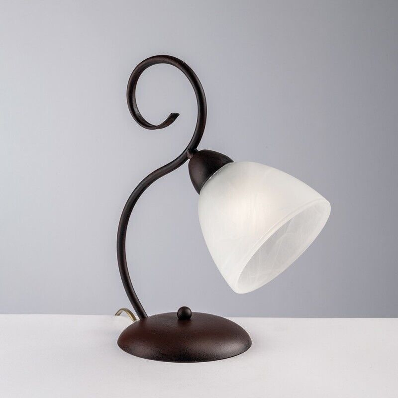 Collezione Aurelio STILE PULITO ED IMPONENTE PER COMPLETARE IL VOSTRO ARREDAMENTO Lumetto 1 luce in ferro battuto nero con decorazione ruggine. Una base tonda un braccio che termina con una curvatura a ricciolo eseguita abilmente da esperti artigiani del settore ed infine corredato da un piccolo e grazioso diffusore in vetro alabastro bianco. La tonalità nera con decorazione ruggine a contrasto coi vetri bianchi si abbina perfettamente con lo stile classico o in arte povera.