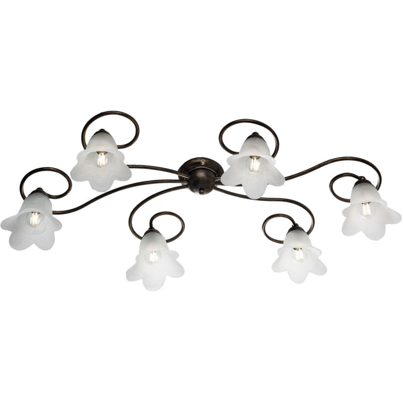 Plafoniera in ferro laccato marrone con decorazione oro antico e diffusori in vetro diametro 14 alabastro bianchi 6 luci
