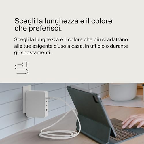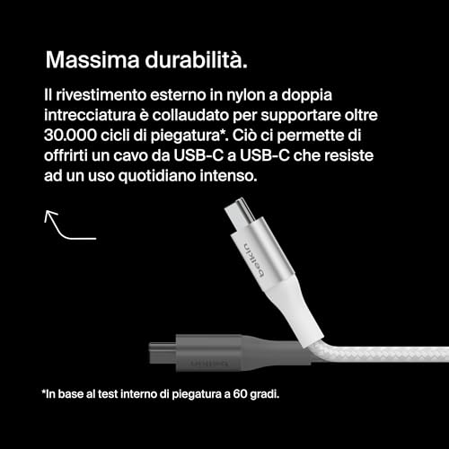 DURA NEL TEMPO: il cavo USB-C è progettato per un uso a lunga durata, con un serracavo in alluminio anodizzato e un rivestimento in nylon a doppia intrecciatura, ed è stato testato per supportare fino a 30.000 cicli di piegatura e 10.000 connessioni.