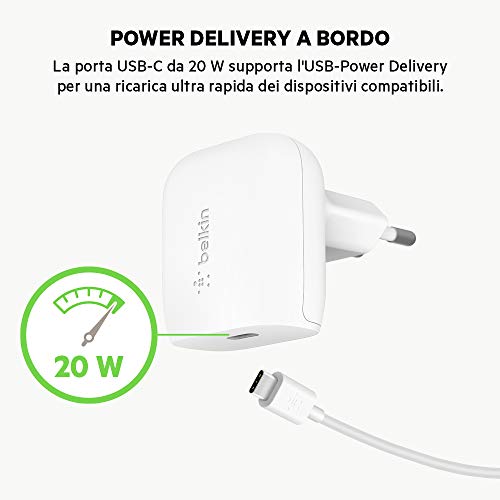 Belkin Caricabatteria da parete USB-C 20 W + cavo da USB-C a Lightning, 1,2 m (Caricabatteria per iPhone 14, 13, 12 iPad Air 2020)